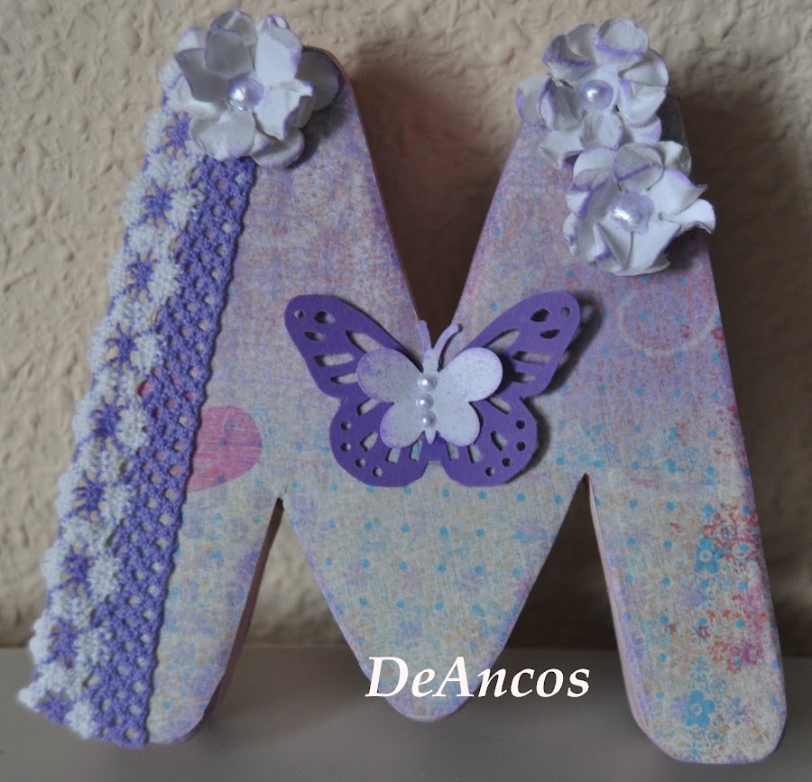 Esta primera, después de forrarla por los dos lados con un papel en un lila predominante del taco-papeles de María, pinté todo el canto de la letra con glimmer mist del mismo tono. A continuación entinté todos los bordes con Versafine.