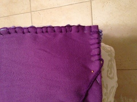 Además, al cogerla, los dedos se nos metían entre las lanas tejidas y no la queríamos romper, así que decidimos coserle por la parte de detrás esta manta. Y así lo hicimos. En un primer momento pensamos ponerle una cinta de manta rematando todo el borde, pero no nos resultó fácil encontrar el color adecuado, así que optamos por ese punto de manta, que tenían las que había por mi casa cuando yo era niña, y que le da un toque rústico, muy adecuado. Y Juan tuvo la paciencia de ir cosiendo tooooodo el borde puntada a puntada, con el punto más uniforme que pudo hasta finalizarla.