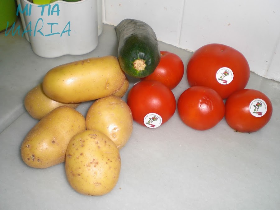 Por otro lado cortamos la patata y el calabacín en trozos pequeños y finos y lo ponemos a freir a fuego lento, con el aceite frio. No hace falta poner mucho aceite, además luego añadiremos toda la mezcla al tomate, con lo que no os paseis de aceite, más vale quedarse cortas y añadir si hace falta.