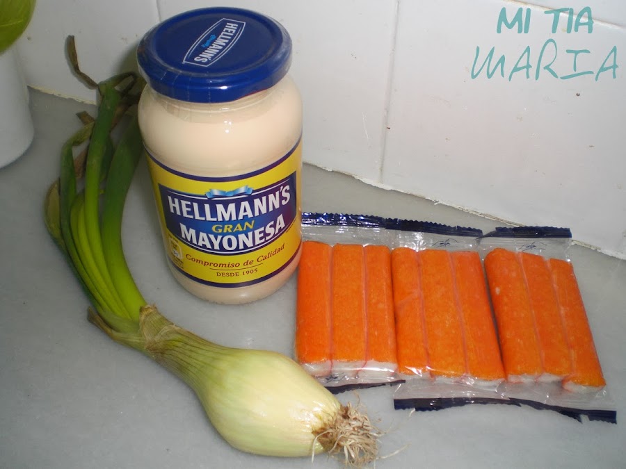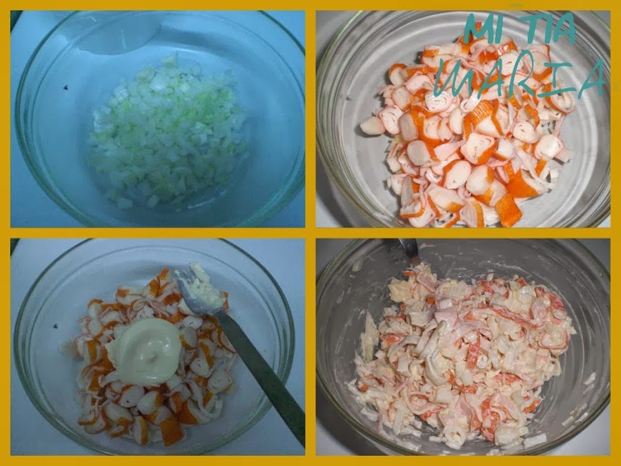 Picamos la cebolla pequeñita y le ponemos un poco de sal, añadimos los palitos de cangrejo cortados en lonchas. Yo uso los frescos por que al cortarlos quedan más bonitos, ya que se abren en tiritas y me gustan más, pero podéis gastar congelados si os apetece. Si queréis podéis añadir unas gambas pequeñas cocidas, le da otro sabor, yo en esta ocasión no le puse por que no tenía.