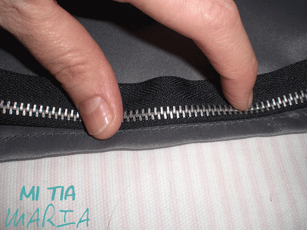 Montamos la cremallera en la parte del derecho y un centímetro hacia adentro, para luego usar este trocito para unirlo a la parte de fuera.