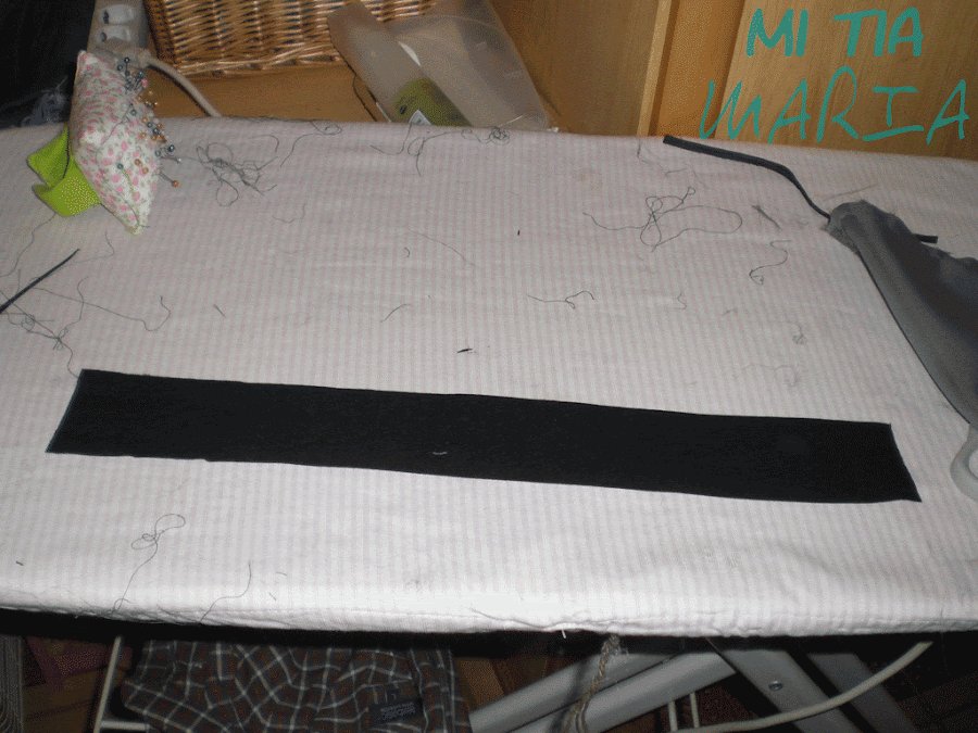 Cortamos una pieza de 4 centímetros de ancho y el largo que necesitéis para meter la mano con comodidad más las costuras. Y hacemos el asa.