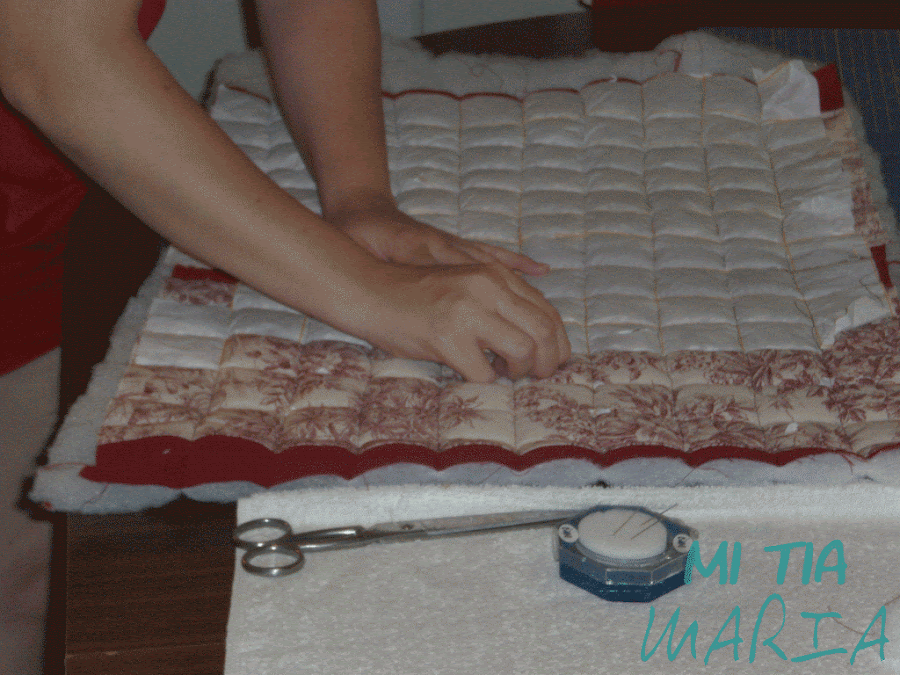 Primero preparamos la capa de tela que va fuera, si queremos hacer algún Patchwork o enmarcar una tela (como es mi caso) ahora es el momento. Y después cosemos la guata. Para que sea más fácil dibuja la forma con la que quieras hacer el acolchado en un papel de patrón y cose por encima. Yo hice una sencilla cuadrícula, ya que era la primera vez que lo hacía. Y luego retiramos el papel. No os preocupéis si queda algún pequeño trocito de papel, al lavar la pieza se irá.