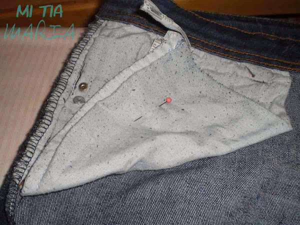 Hay veces que los bolsillos son más largos que el trozo de pantalón que nos ha quedado, yo os aconsejo que los sujetéis con alfileres para no pillarlos al pasar la costura que une las dos partes.