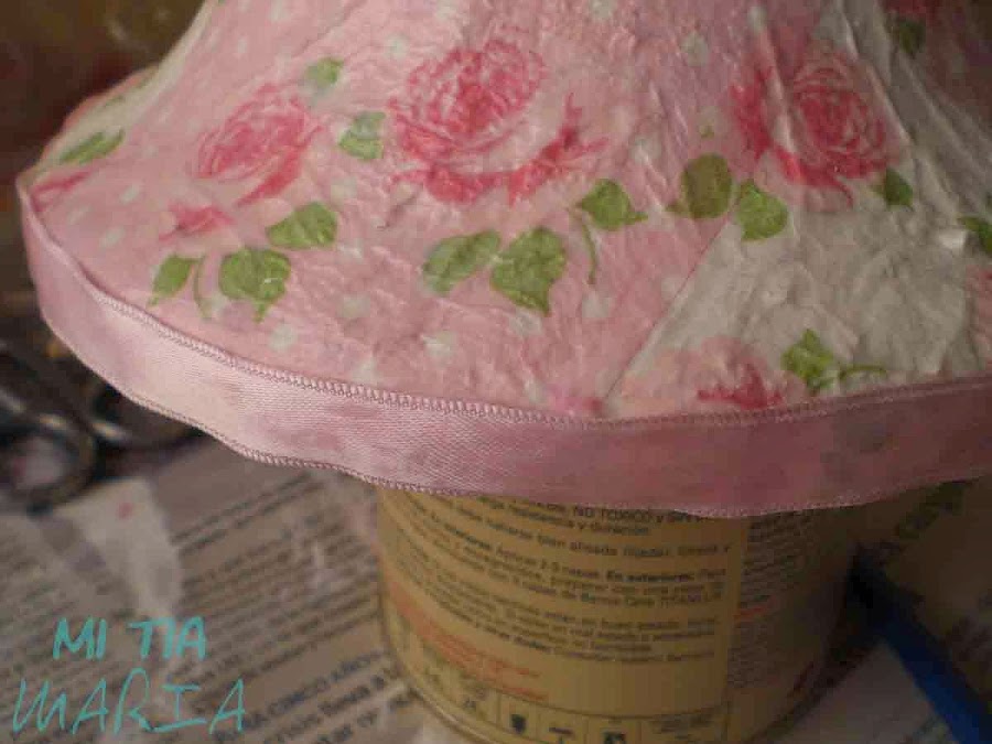 Y también cubrí la base con un trozo de tela a juego. Tanto las cintas como la tela de la base las pegaremos con cola blanca.
