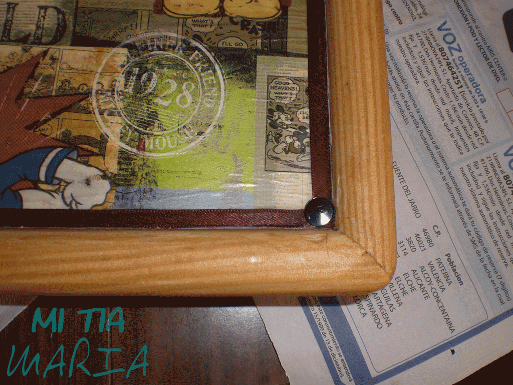 Luego para que no se vean las uniones de las cintas, ponemos una chincheta como en mi caso o un botón o lo que se nos ocurra. Y para rematar le di con una mezcla de cera y betún de judea para que la madera se oscureciera un poco y se viera mejor el conjunto.