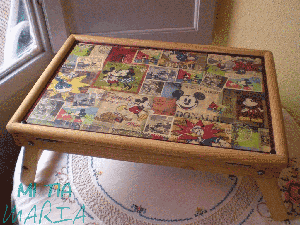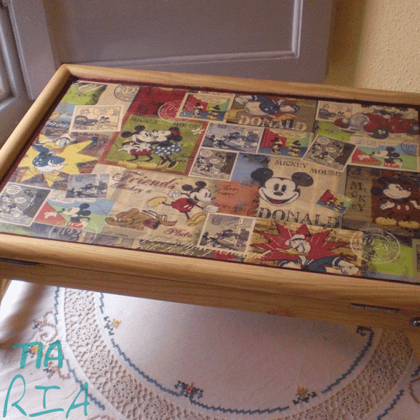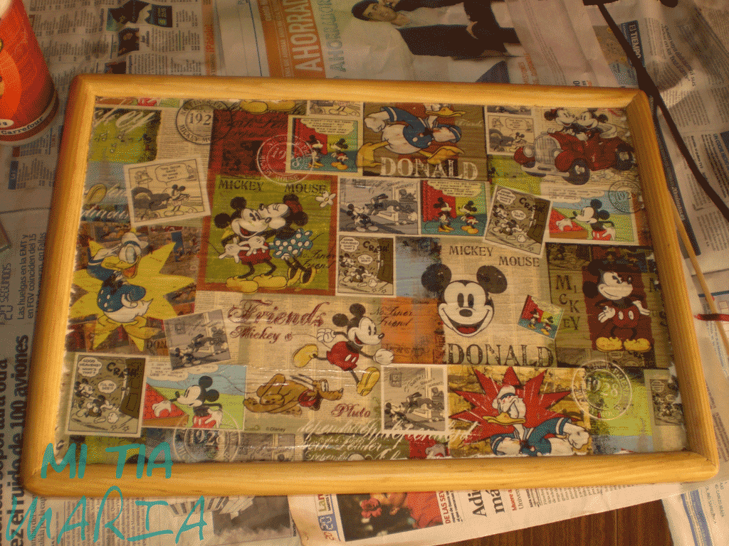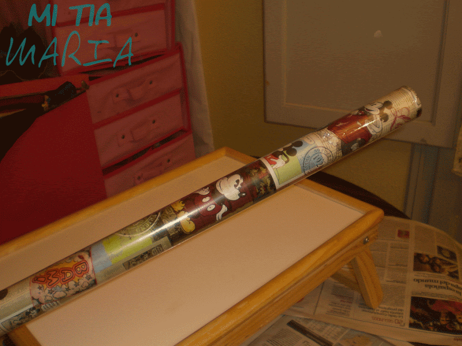 Limpiamos bien la superficie a decorar y elegimos el papel, en mi caso es un rollo de papel de regalo de Mickey estilo Vintage.