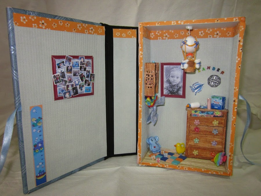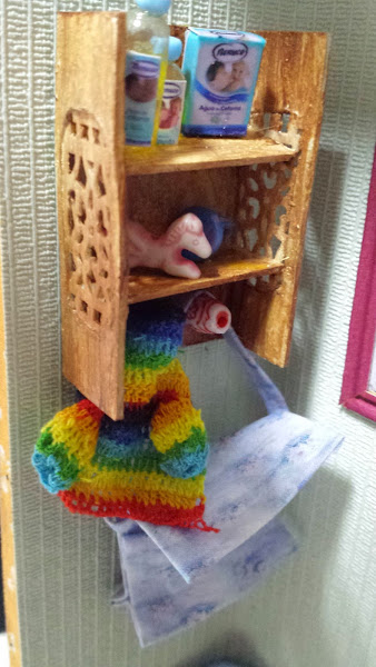 En estas dos fotos podéis ver la estantería, que hice con cartón y un abanico de los chinos, los frascos de colonia son cápsulas de medicamentos, la caja de nenuco un imprimible. el caballito un abalorio, la chaqueta que esta colgada esta hecha a ganchillo y es copia de una que tiene Lander y con la que aparece en la mayoría de las fotos que me pasaron.La bolsa de paseo esta hecha con tela impresa por mi y dentro lleva un álbum de fotos que se puede sacar y ver.