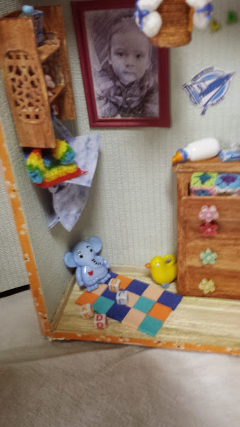En el suelo he puesto una alfombra de gomaespuma con algunos juguetes, que tengo que decir que son abalorios y figuritas de coleteros de cuando mis hijas eran pequeñas.El cuadro de Lander e una foto editada para que parezca un dibujo a lápiz, y el marco esta hecho con cartón corrugado.