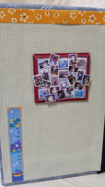 El interior y la contraportada, en la que se ven todas las cositas que hay dentro. En la contraportada hay un medidor, y montones de fotos del niño y en el interior se ve el nombre del niño, Lander, escrito con letras de colores, que en este caso están echas con las sopas de letras.