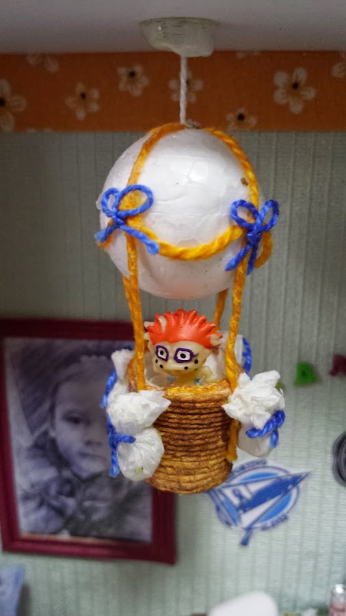 Y por ultimo la lampara. Esta hecha con una bola de poliespan, perle, la cesta es un tapón de pasta de dientes rodeado de perle y pintado, el muñeco de un coletero y los saquitos de papel de cocina.