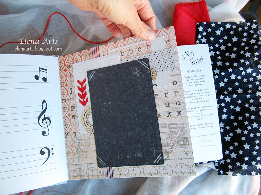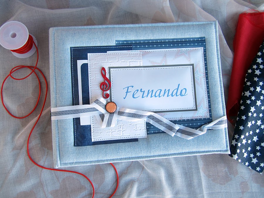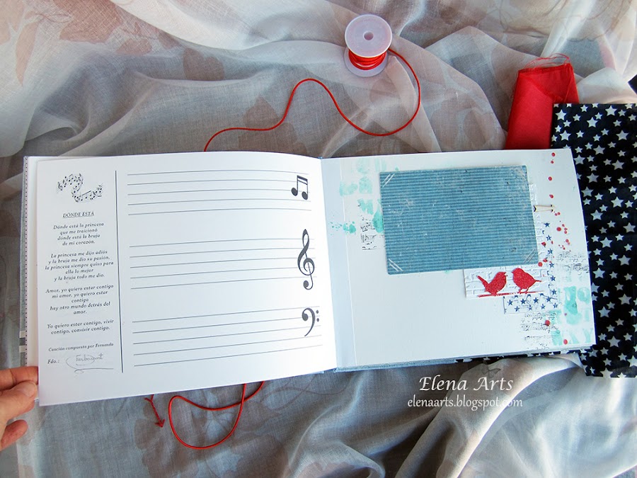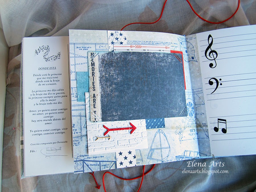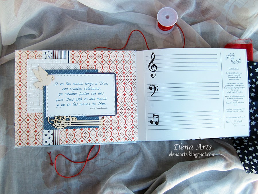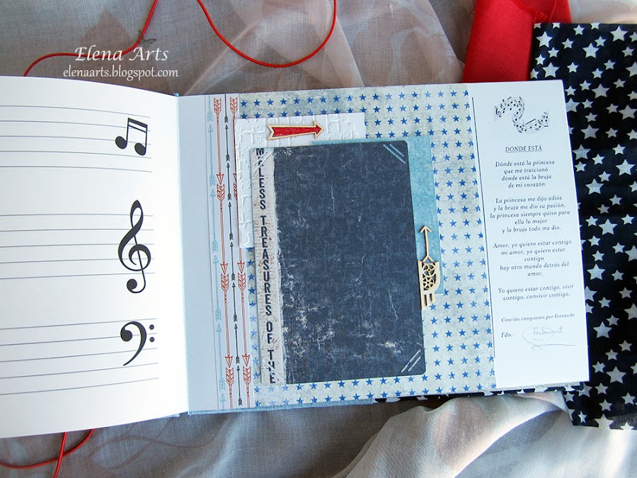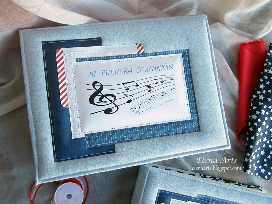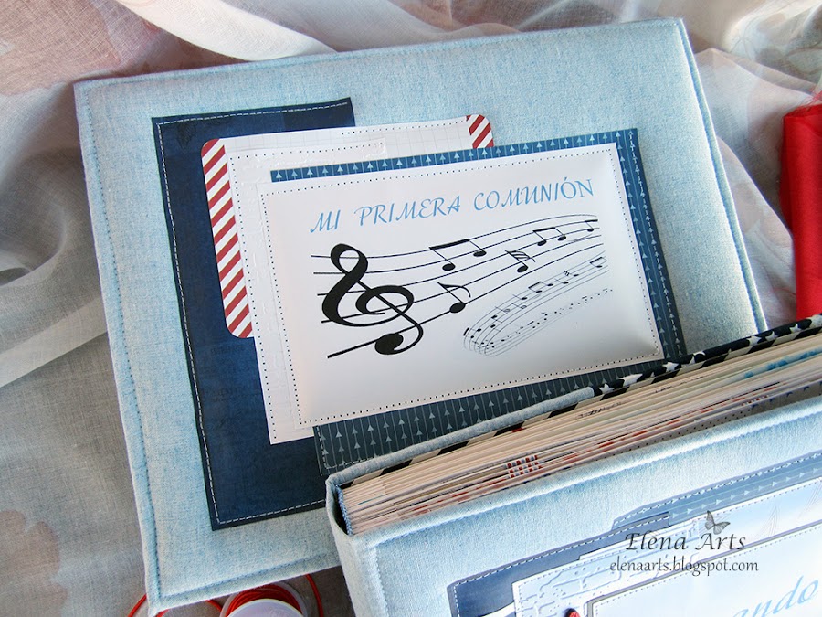Además del libro, también hice la caja. Utilicé una tela de lino azul clarito y para adornar, unos papeles decorados. Todos está cosido a máquina, que me encanta cómo queda el punto. Las notas musicales adornan la tapa. Realmente después de hacer las fotos de la caja, cambié alguna cosa en el diseño pero después no volvía a fotografiarla. Lo que hice, fue añadir una cenefa de chipboard y un brad rijo en el lado izquierdo.