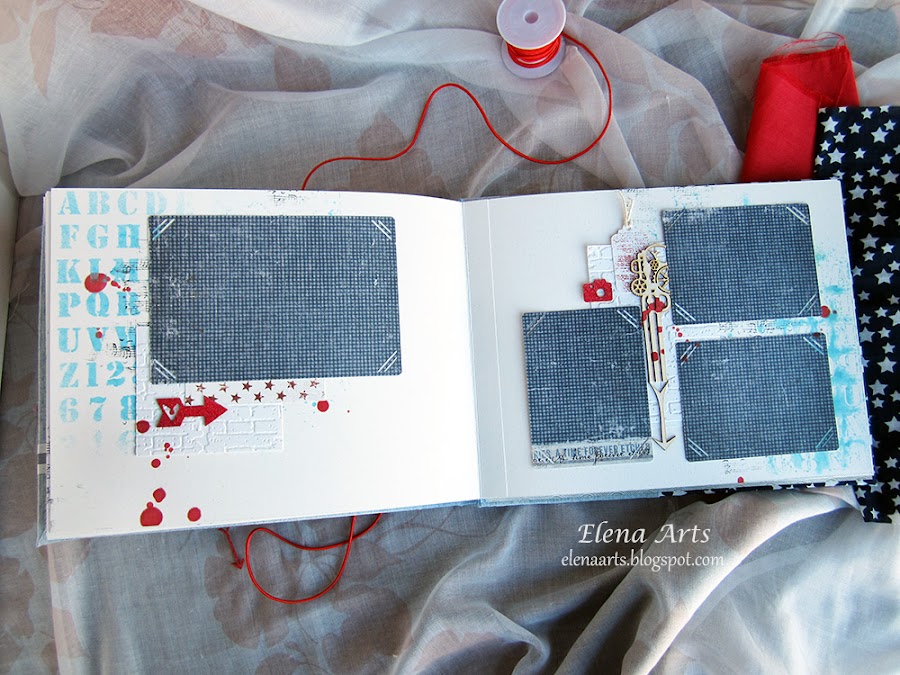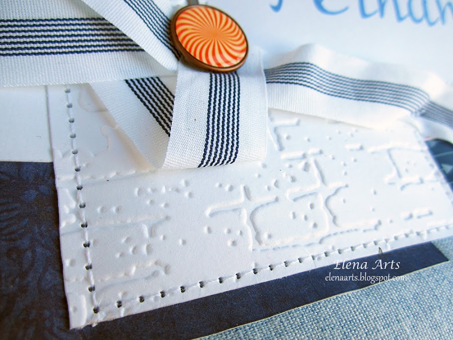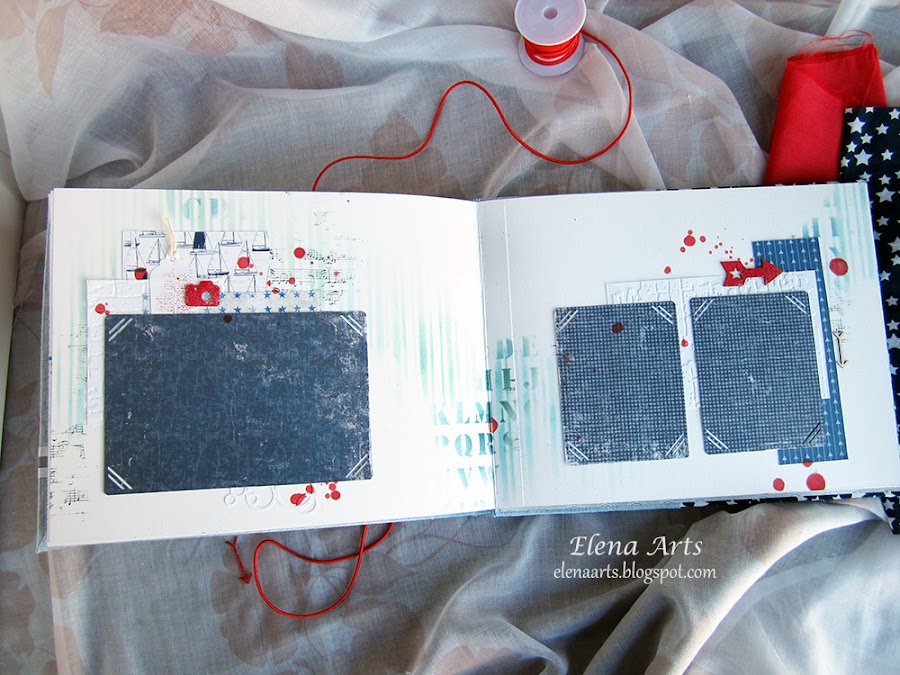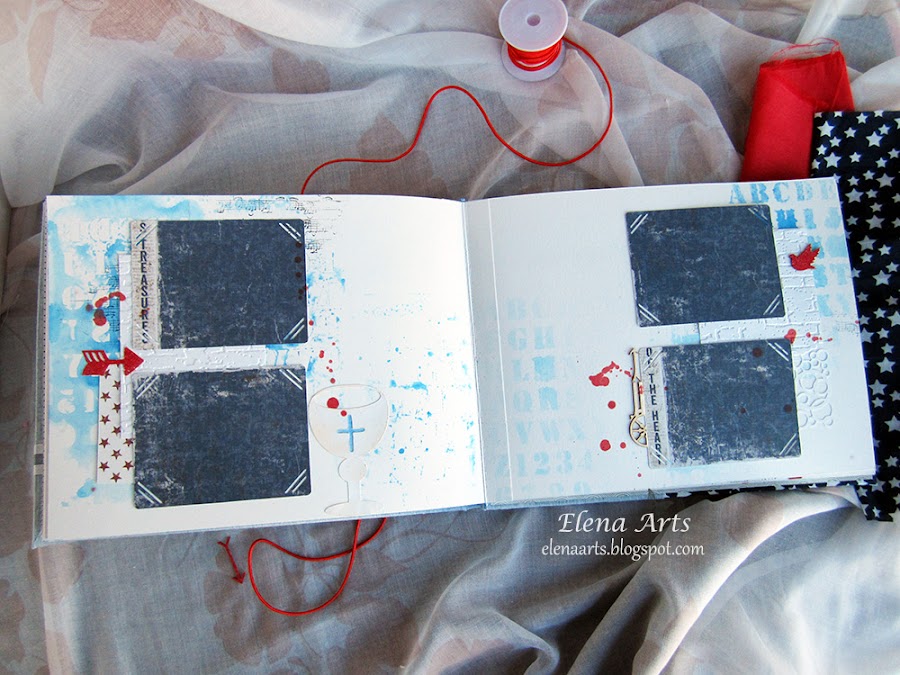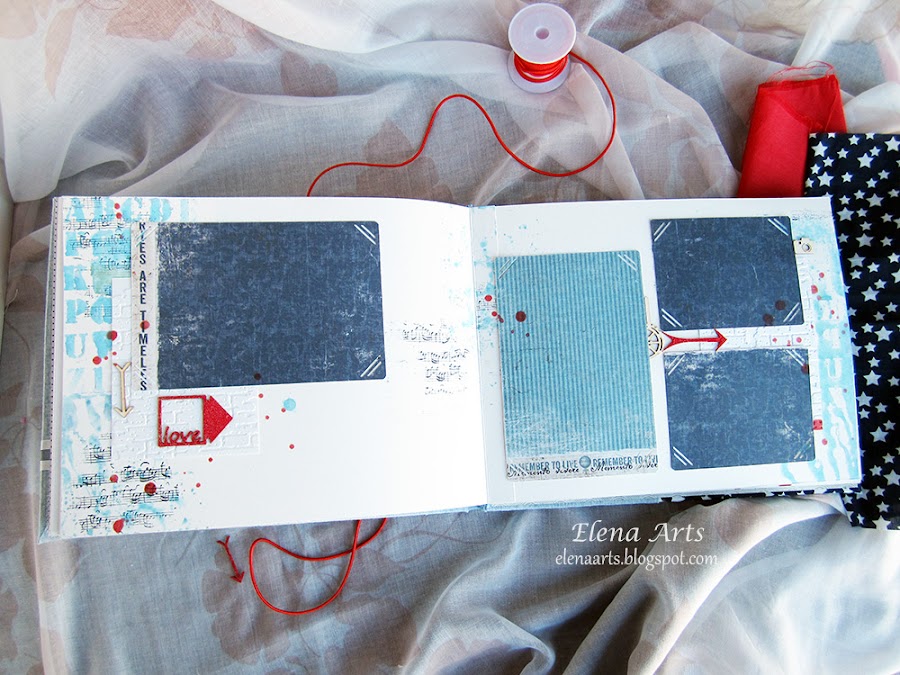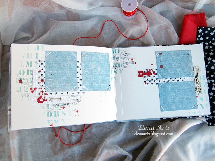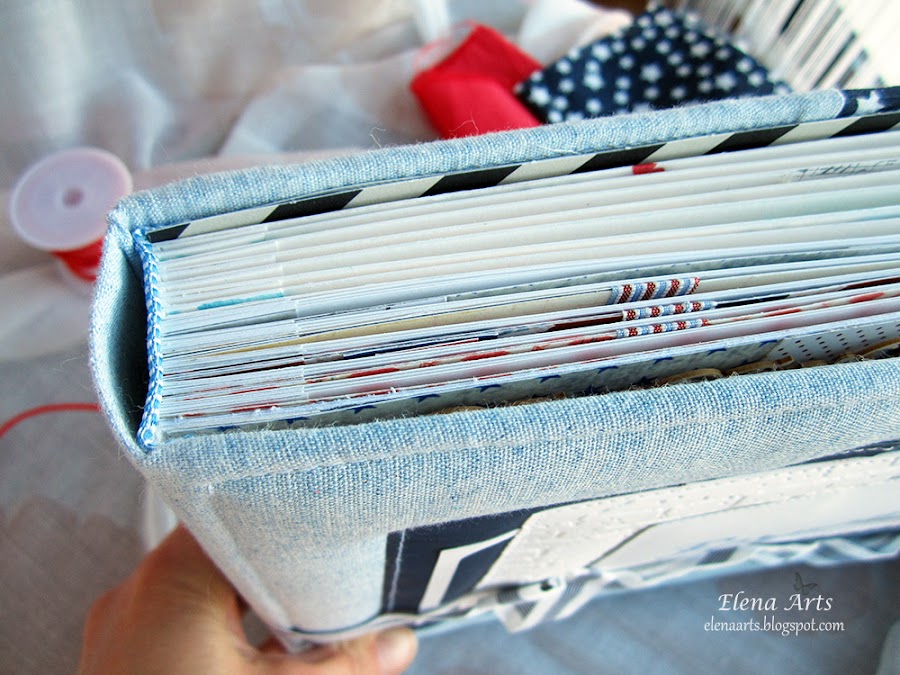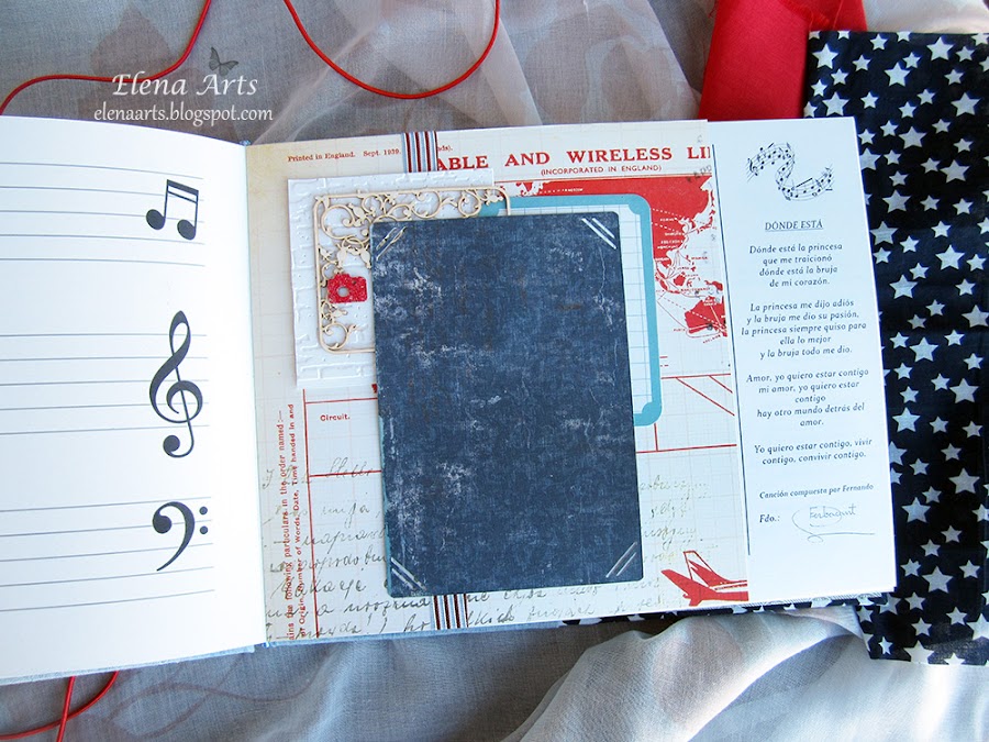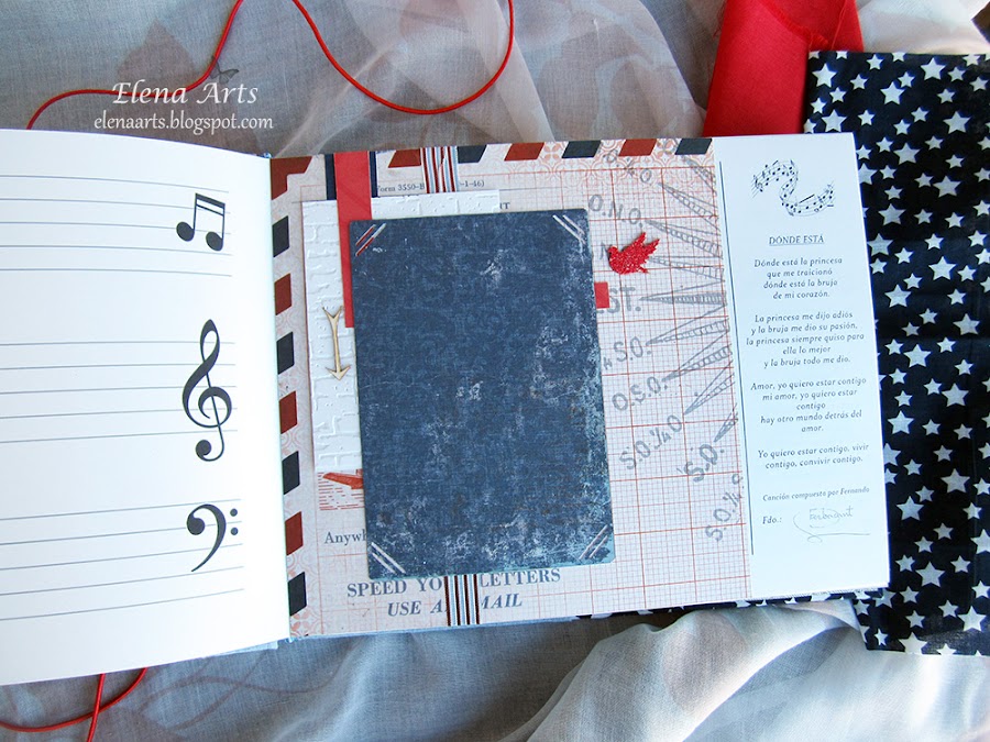 Además del libro, también hice la caja. Utilicé una tela de lino azul clarito y para adornar, unos papeles decorados. Todos está cosido a máquina, que me encanta cómo queda el punto. Las notas musicales adornan la tapa. Realmente después de hacer las fotos de la caja, cambié alguna cosa en el diseño pero después no volvía a fotografiarla. Lo que hice, fue añadir una cenefa de chipboard y un brad rijo en el lado izquierdo.