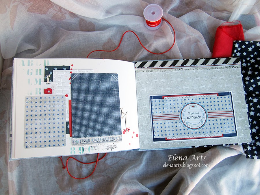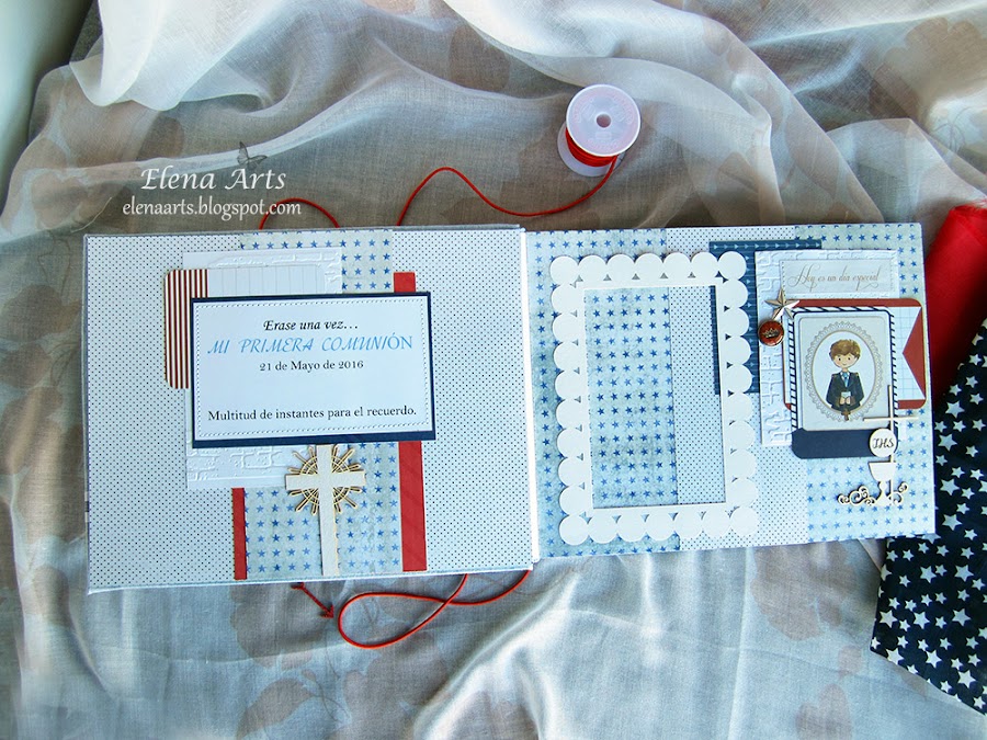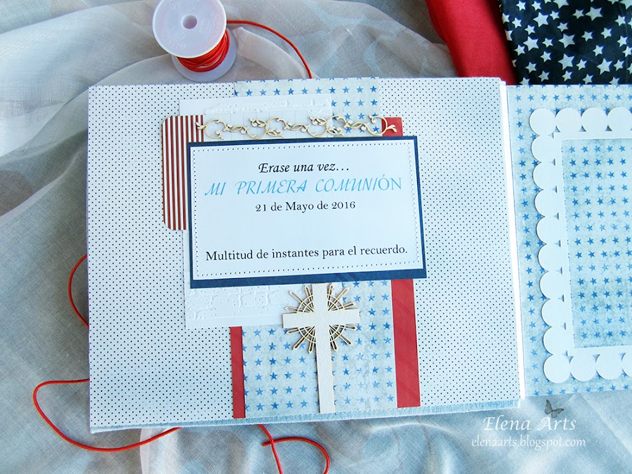 Al abrir el libro encontramos la contraportada y la primera página con un marco para la foto. El fondo azul con unos toques en rojo queda muy bonito. El rojo le da alegría y como es el libro principalmente para comunión, las páginas están adornadas con los elementos decorativos correspondientes.