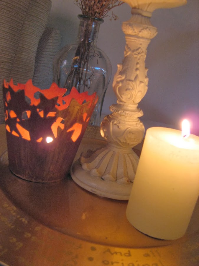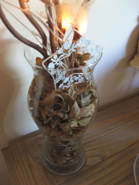 No sabía como ponerlas y se me ocurrió llenar un jarrón de cristal, de algunas de las toneladas de hojas del jardin que estamos recogiendo todo el otoño. En esta foto no me dí cuenta de que estaban torcidas...