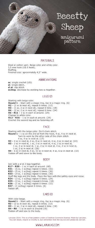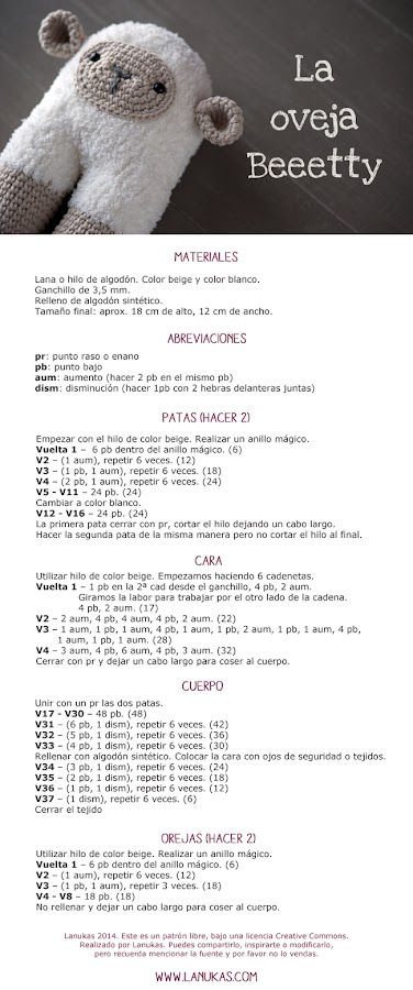 Here you have the pattern of the Beeetty Sheep in English. If you have any questions, or you detect any errors, you can email me at hola@lanukas.com. Happy crocheting!