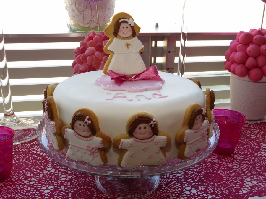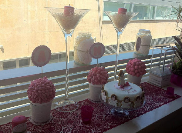 Mesa dulce con la colaboración de las cucadas de mary que nos hizo cakepops y galletas de comunión que había en cada plato como marcasitios. La confiteria Las cositas de dedulce, que nos preparó la tarta de cava y fresa, los macarons y los cupcakes .