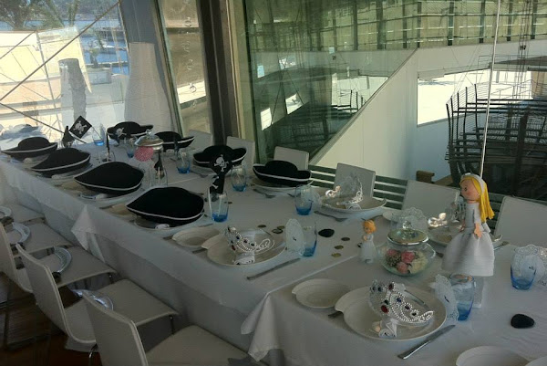 La mesa de los niños con coronas,varitas mágicas, sombreros,espadas de piratas, monedas, parches etc..