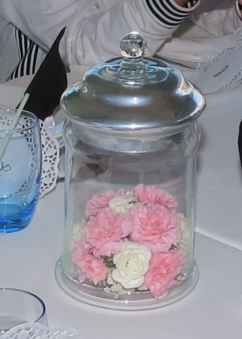 Decoré las mesa con centros de flores rosas y blancas dentro de bomboneras y botes de cristal que tenían en el restaurante.