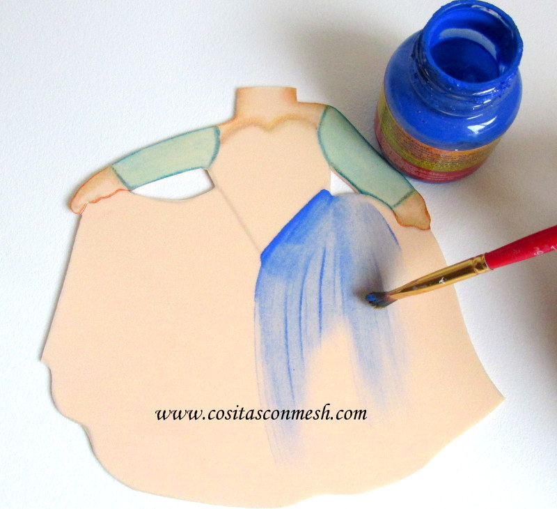 3.-Esta es la parte que más me gusta, pintamos de azul el vestido, usa un pincel de pelo suave, y pinta en una sola dirección, el foami absorbe rápido la pintura, te aconsejo cargar con mucha pintura, luego arrastrar el pincel hacia la parte inferior del vestido, algunas zonas del vestido puedes dejarlo más clarito.