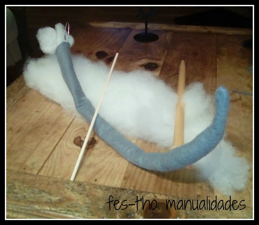 Un "tubo" cosido con fieltro sería la colita del disfraz. Que rellenó, supongo que con mucha paciencia, con el relleno de un cojín. Para que se mantubiera para arriba y poder darle forma le puso un alambre por dentro.
