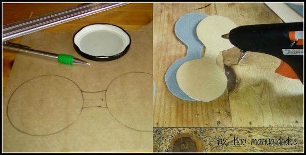Con la ayuda de la tapa de un bote dibujó una par de circunferencias sobre un cartón que unió haciendo como unas gafas (como se ve en la foto). El cartón, aparte de servir para dar grosor y consistencia, también le sirvió como plantilla para el fieltro gris. Y lo pegó todo con silicona caliente.
