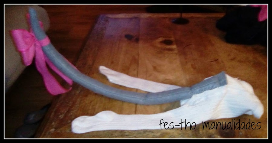 Y para que hiciera conjunto con las orejas lo remató con otro lazo rosa, bien grande, ¡que se vea! El remate final, coser la colita a las medias que tenía que llevar la niña, bien cosida para que no se cayera. La foto que me pasó mi madre de la cola cosida a las medias, la verdad, da un poco de mal rollo...