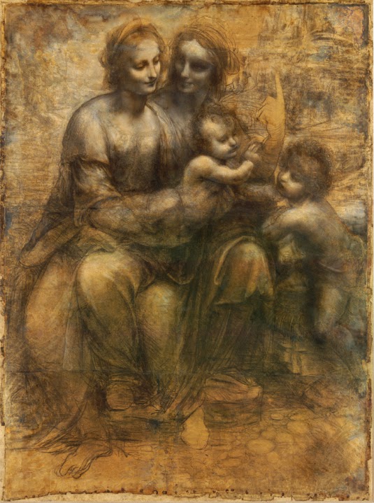 Don Leo no siempre seguía el mismo proceso, hacía lo que le daba la gana, sin más. Por ejemplo, en el primer cuadro que os he enseñado hoy, el de Santa Ana, la Virge, El Niño y San Juan, que consideramos que es un estudio preparatorio para una obra más acabada, vemos que hacía un esfumato con veladuras ocres que era divinas, pero luego las reforzaba con veladuras grises más oscuras y con trazos de carboncillo que difuminaba con el dedo, y por último con nuevas veladuras de tonalidades más claras que acentuaban las luces de las caras.