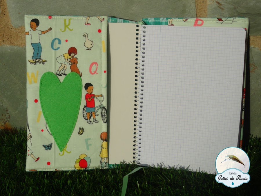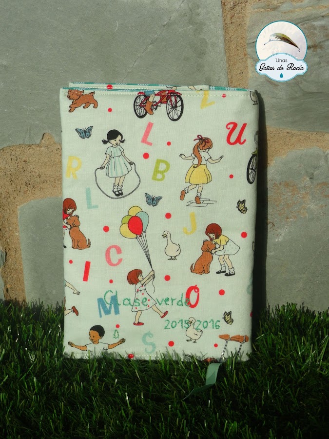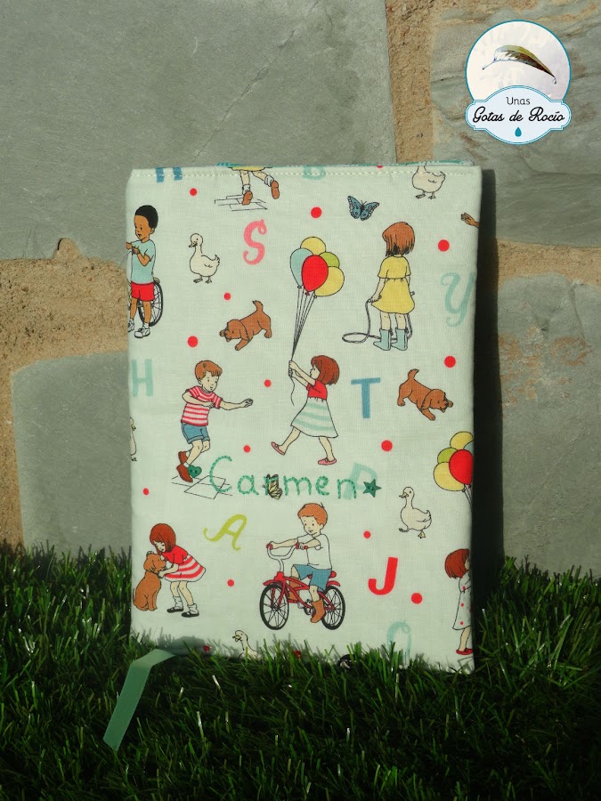 Tenía muchas ganas de trabajar esta tela pero por más que la ofrecía, nadie la quería. Hasta que un grupo de mamis pensó lo mismo que yo. Y es que es una tela perfecta para hacer una funda de libreta y regalar a una directora de guardería.
