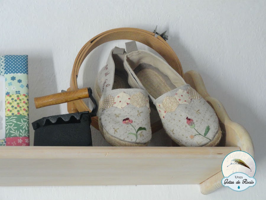 No os vayáis, que os quiero enseñar un par de cosas más. ¿Recordáis las zapatillas de esparto que me hice este verano? Pinchando aquí las podéis ver. Pues bien, me las puse un par de días este verano pero he decidido que no me las voy a poner más. Me da mucha penita que se me estropeen. Ni siquiera voy a gusto con ellas por la calle pensando en un pisotón o un suelo demasiado sucio. Así que les he reservado un huequito en mi cuarto de costura, como si fueran un muñeco decorativo más. Así las disfruto todos los días y no sufro más, jeje.