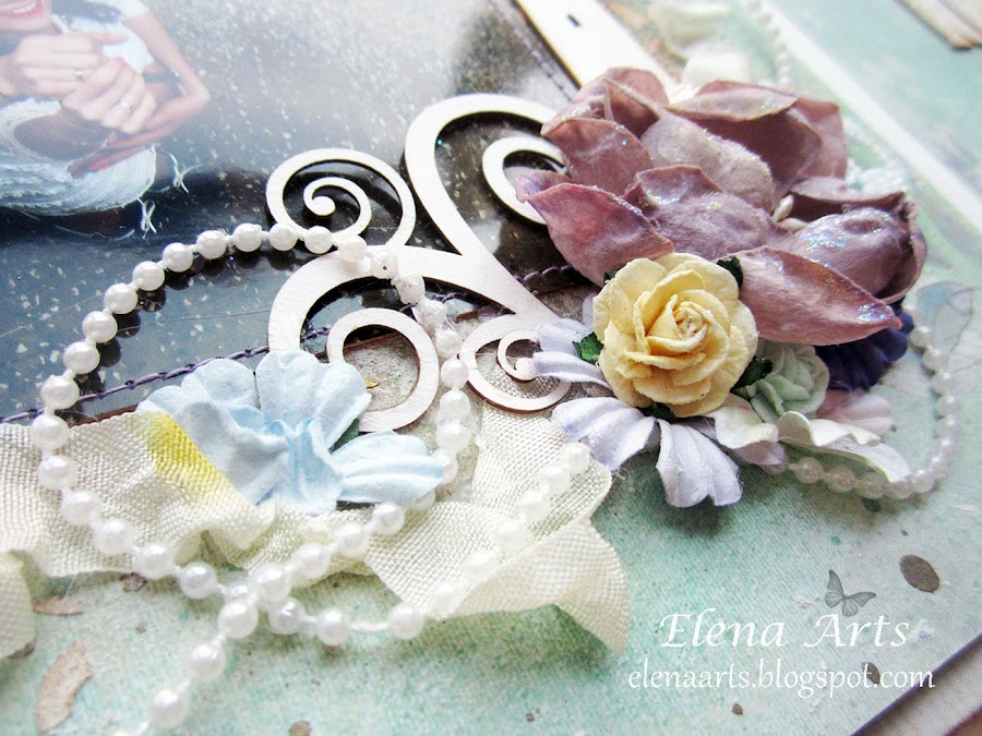 And this is the fourth page for another photo to the bride and groom will decide to put. I have incorporated the transparent dot fabric, excess paper from a die-cutting element, flowers, chipboard, embossing paste...