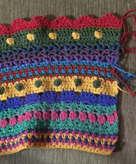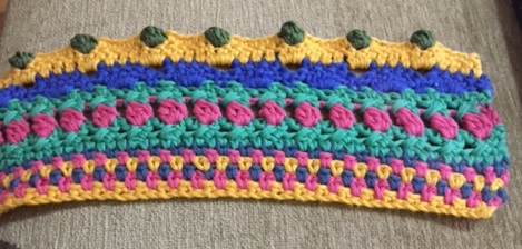 Al final decidí que la culpa de que quedara tan ondulado era del punto garbanzo de la vuelta anterior y lo deshice, cambiándolo por cruces y motas, que había leído que era más cerrado y encogía un poco la labor, así que lo hice y me quedé tan contenta.