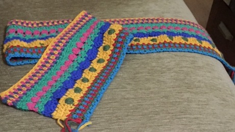 Hasta aqui yo iba muy contenta, siguiendo las clases todas las semanas y llegó el Punto Garbanzo. Le hice un par de veces porque me quedaba muy suelto, leí que podia ser que me estaba confianzo y tejia deprisa por lo que no le ponía la tensión adecuada. Así lo hice con más tensíon y efectivamente, me quedó genial y me sobraba lana de la vuelta anterior, aqui el resultado