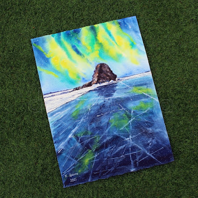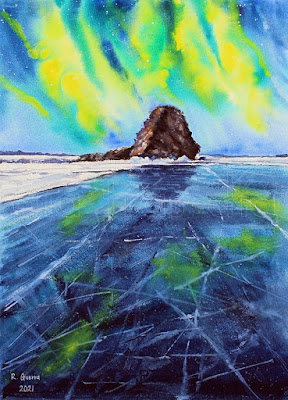 Y la semana pasada por fin me animé a pintar de nuevo el lago Baikal, esta vez con la aurora boreal.