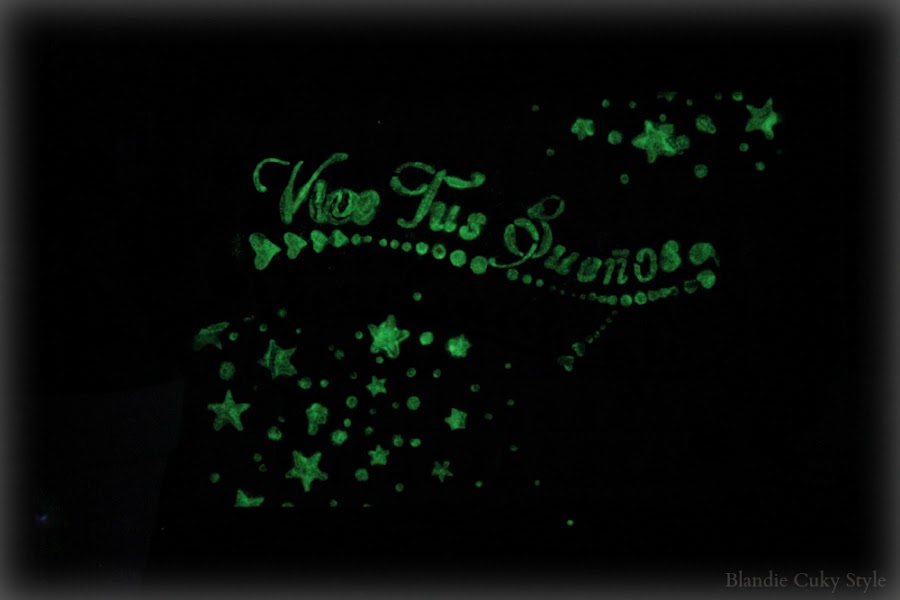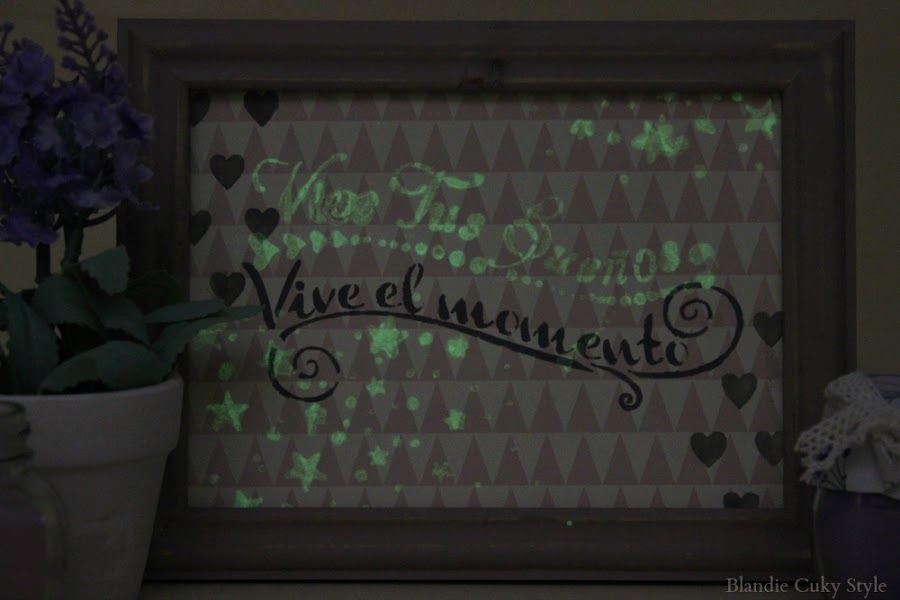 Como ves, es una lámina con mensaje que de día decora y queda de maravilla, por ejemplo, en la mesita de noche. Y, cuando todo se apaga porque llega la hora de acostarse, aparece en la misma lámina otro mensaje, pero esta vez, ¡¡en tono fluorescente!!