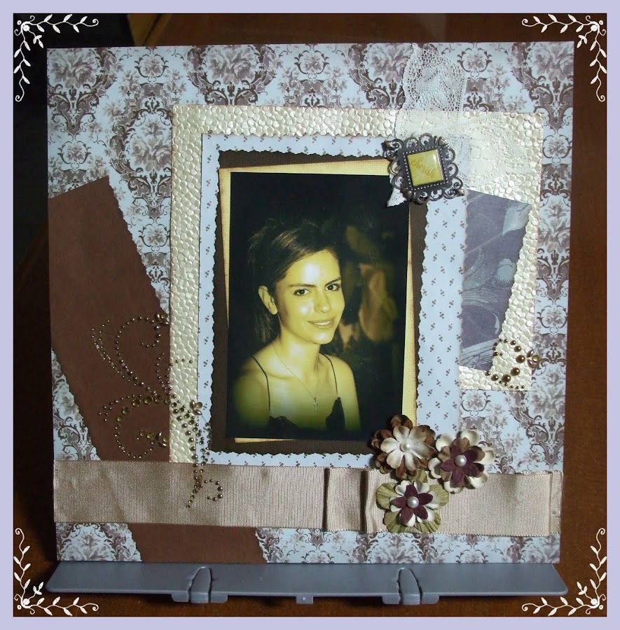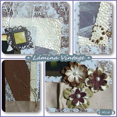 Aquí pongo detalles de la misma... adornos con encajes y un stikers metálico precioso, un dooling de perlitas, unas flores de papel en tonos marrones y todo montado sobre un precioso papel con embosado en color azul celeste.
