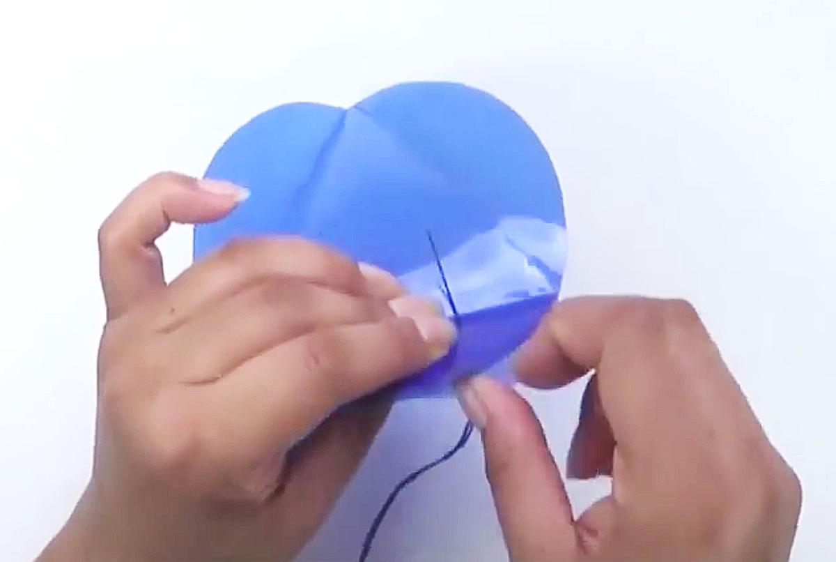 Une con la aguja e hilo, 5 piezas por una de las líneas del triángulo, fijate que las 5 puntas queden en un mismo punto.