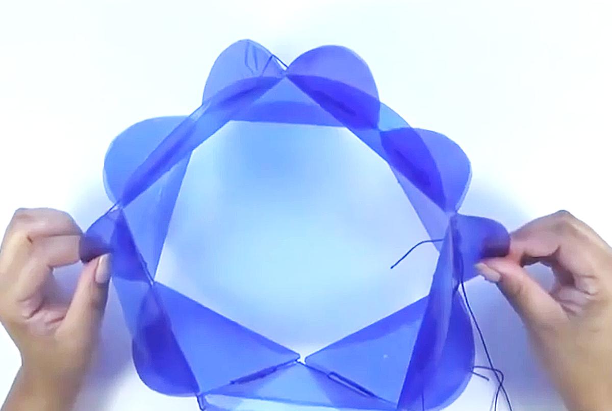 Une las dos tapas de 5 piezas, al círculo de 10 piezas, una a cada lado, así das forma a la lámpara.