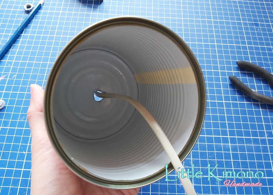 7. Ahora vamos a trabajar la lata, en mi caso el casquillo que tenía era reciclado de otra lámpara que se me rompió, así que con ayuda de un tirafondo y un martillo hice un agujero en el centro de la lata y con unos alicates girando suavemente fui abriendo el agujero hasta el tamaño deseado para pasar el cable y poder enroscar la tuerca al otro lado.