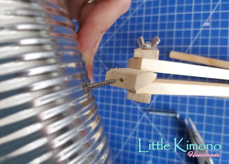 9. Ahora el tornillo pequeño lo pasaremos por la lata de dentro hacia afuera, buscando el centro de la lata, una vez lo hayamos pasado enroscamos al listón de 6cm (el cuello).