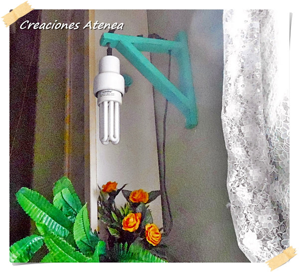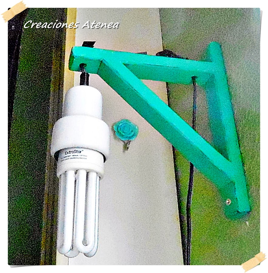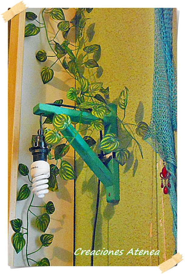 Hace tiempo que en pinterest y en blogs de decoración vi esta clase de lámparas. Y necesitaba una luz al lado del sofá. Y de no sé dónde (de la calle, creo), había recogido una escuadra de madera nuevecita. Así que la lijé bien para quitar todos los cantos y esquinas y la pinté de verde esmeralda. De nuevo no sé si llamar así a ese color, porque lo obtuve mezclando yo las pinturas (me encanta).