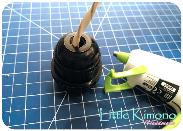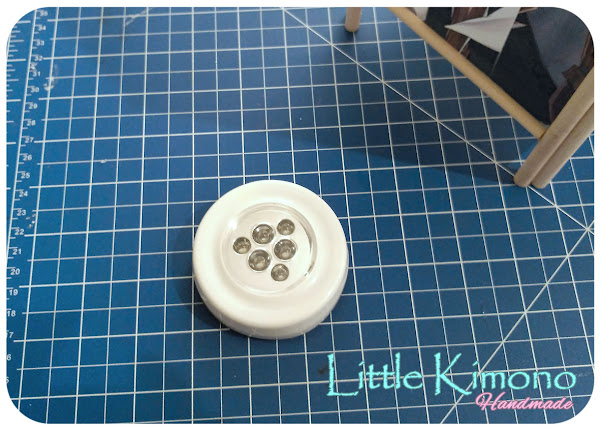 8. Ésta nos servirá para colocar la iluminación, puede ser una eléctrica o una lámpara led si no queréis complicaros ;) Ponemos un pelín de silicona caliente en la base plástica y colocamos dentro de la lámpara sobre los palitos anchos.