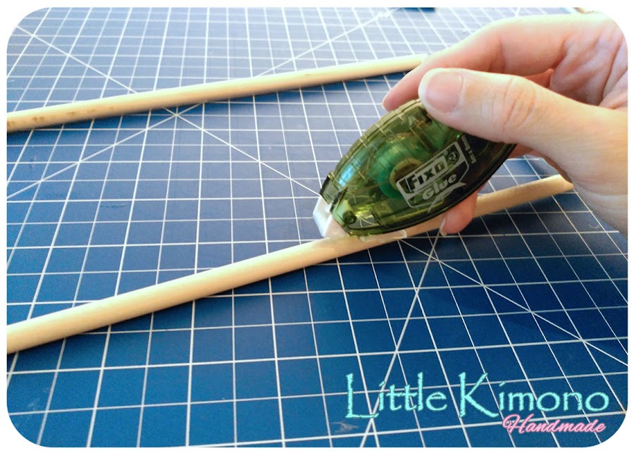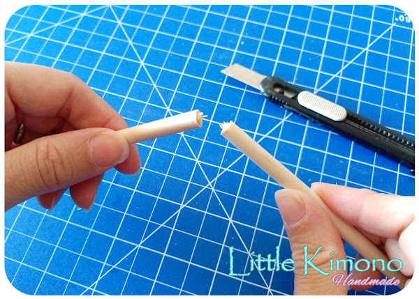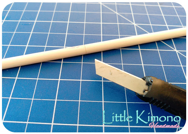 1. Con los palos de 6mm cortamos 8 trozos de 11cm.Podemos hacerlo sin problemas con el cúter, iremos cortando alrededor del palo y luego partiremos, con ayuda de una lija quitaremos las astilla.
