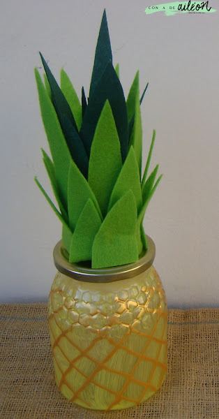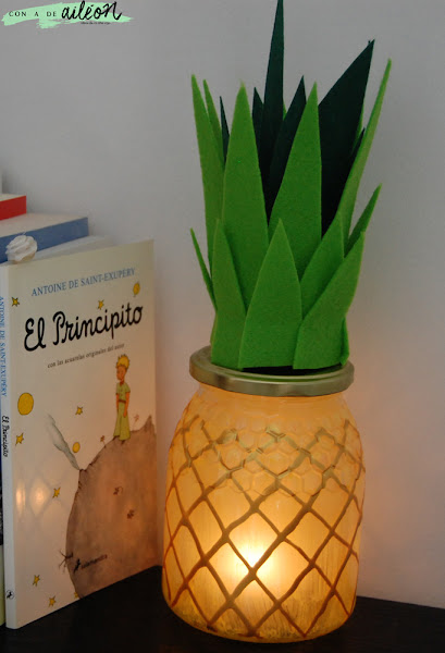 La temática viene por el aire veraniego que nos está inundando por las Españas, ya que últimamente ¡veo en todos lados o piñas o flamencos!, así que se me ocurrió reciclar un bote de cristal y reconvertirlo en lamparita para fiestas en terrazas o incluso para una luz nocturna led en la habitación de cualquier niño (el mío está tan encantado que le ha dibujado a los personajes del que "vive en la piña debajo del mar" para adornarla más).