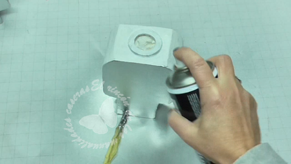 Para reforzar la pieza, con tubos de papel higiénico y trocitos de cartón del mismo ancho que la lámpara los pegaremos dentro a modo de refuerzo, por último le pegaremos la otra silueta que recortamos en cartón con silicona caliente.