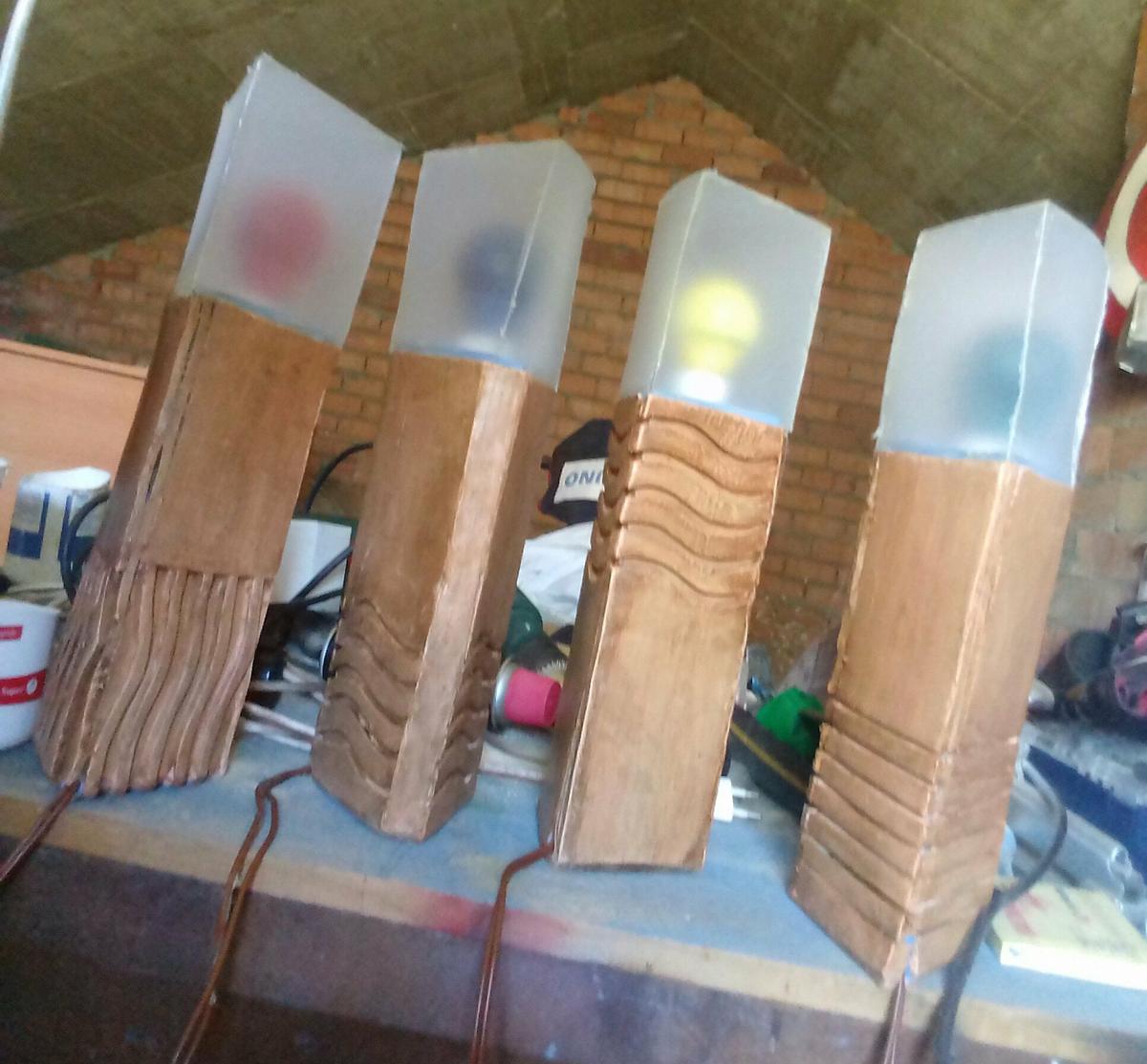 Mientras tanto he dado una capa de cola a cada piedra y las he pintado de color tierra, dando sobre ellas una capa de betún de judea para “envejecerlas”. Finalmente he unido todas las piezas, pegando el casquillo a una tapa de goma eva y haciendo con plástico duro semitransparente la pantalla. Recordad colocar las bombillas en las piedras correctas, la roja en la piedra de fuego, la verde en la de tierra, etc.