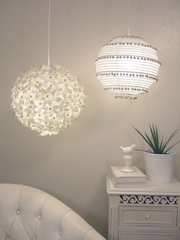 La segunda y tercera idea, respetando el color blanco inmaculado de la lámpara, viene a cargo del blog Crafty Nest. Tan solo se necesitan unos metros de madroños blancos y algo de pegamento para pegarlos. Y si preferimos algo más recargado, con unas flores decorativas podemos hacer el otro diseño. Podéis ver el tutorial completo en su blog.