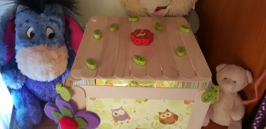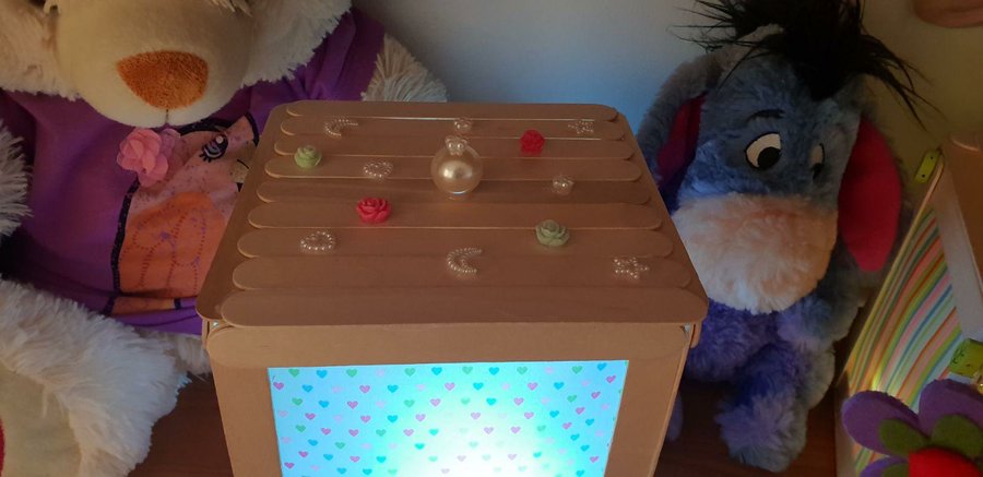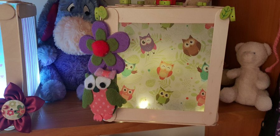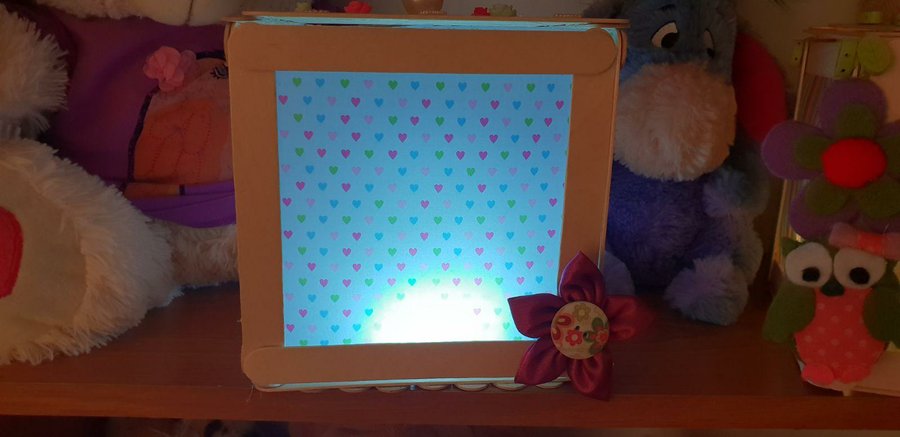 Esta lámpara tiene una tapa también hecha con palitos para que los peque puedan apagar y encender ellos mismos la luz,tambien la he decorado ,con una pulsera que tenía mi hija y no la utilizaba.