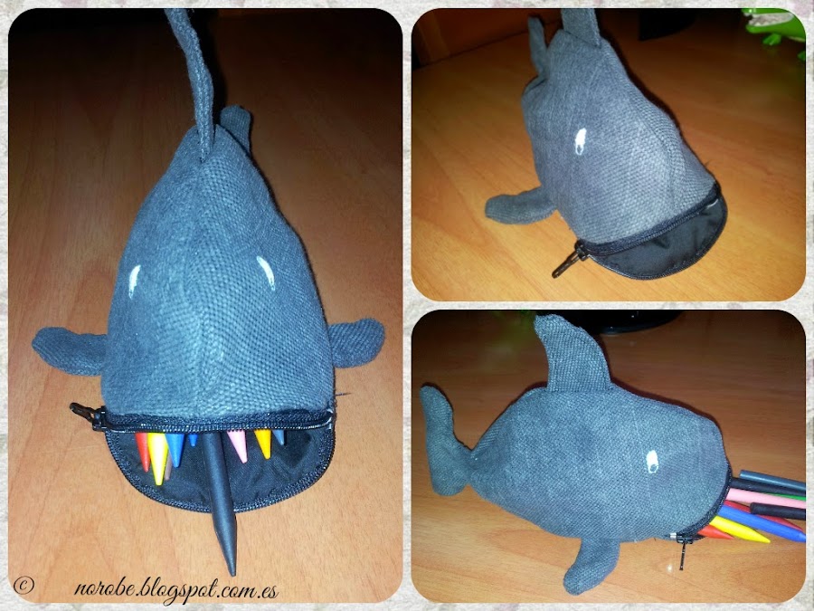 Lo que le hice fue este estuche para lápices con forma de pez. La idea se me ocurrió porque en un principio pensé en hacerle un muñeco, pero ya le he hecho varios y me parecía aburrido regalarle otro, así que opté por hacerle algo diferente y me acordé de que no tenía estuche para los lápices de colores, los guarda en una caja. Me puse a buscar por internet y dí con el patrón de un pez que me gustó mucho, pero tuve que modificarlo y agrandarlo.