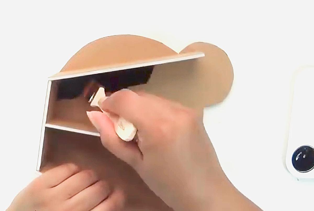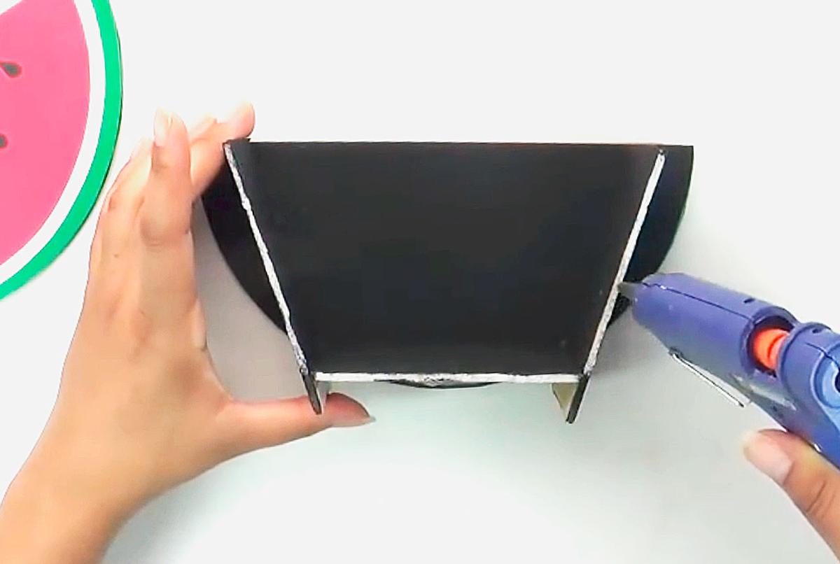 Pegar las piezas para formar el contenedor; la más pequeña a la base, luego los laterales y en medio la última pieza para hacer de separador.